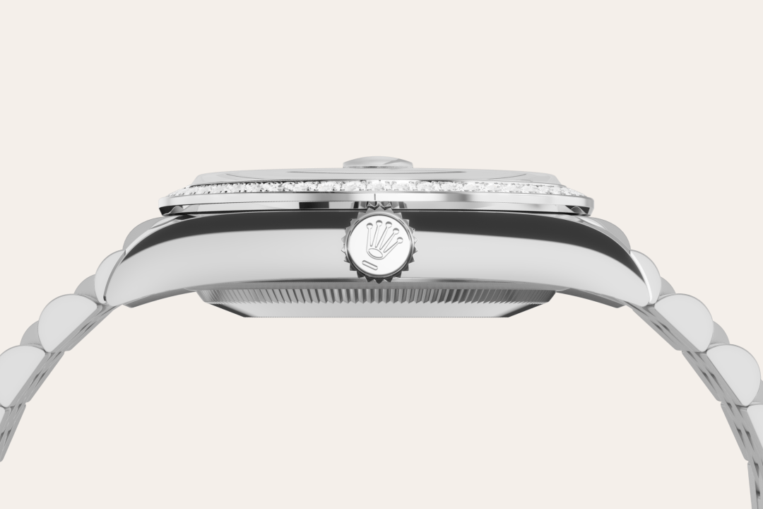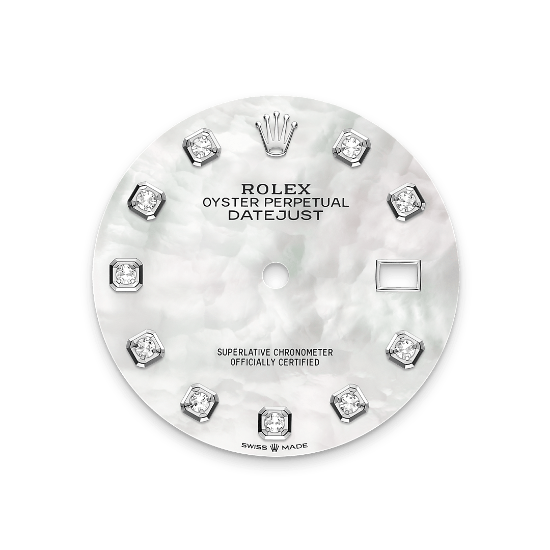 Il quadrante presenta diamanti in castoni d’oro 18 ct. La madreperla è per sua stessa natura ricca di mistero. Può essere rosa, bianca, nera o gialla, diversa per colore, intensità e struttura in base alla sua origine e alla parte della conchiglia da cui viene estratta. Da Rolex la madreperla non viene mai colorata artificialmente. Il know‑how e le abilità della Casa vengono piuttosto impiegate per sublimarne la bellezza naturale, conservando le sue sfumature originali. Poiché i quadranti in madreperla sono pezzi unici, non sarà mai possibile trovare un quadrante identico a un altro.